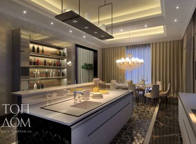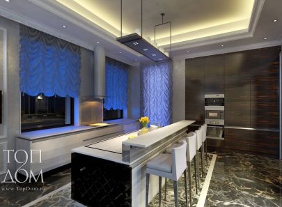 Темное и пестрое напольное покрытие под мрамор входит сюда из гостиной. Кухонная мебель подобрана на контрасте – с белыми лакированными столешницами и фасадами подвесных шкафов, стена со встроенной техникой обшита зебрано. Рабочие поверхности разбиты на две зоны (у окна и остров-мойка). Обратная сторона острова служит барной стойкой. Французские шторы на окнах, отделка штукатуркой с жемчужным отливом, лепные карнизы вносят в интерьер кухни-столовой классическое очарование.