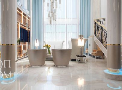 На входе в гостиную установлены круглые колонны с голубой подсветкой сверху и под основанием. Красивый голубой оттенок, созвучный со шторами на окнах, разбавляет колористику интерьера.