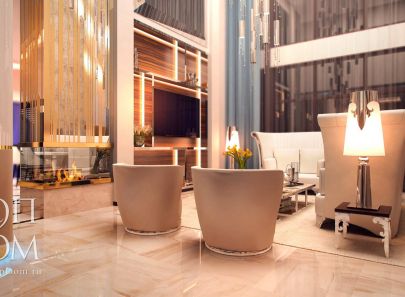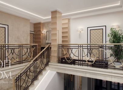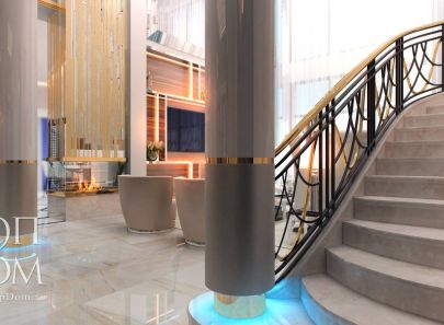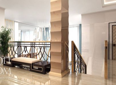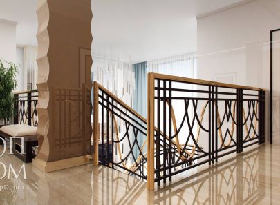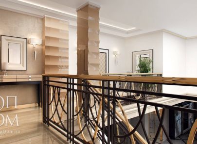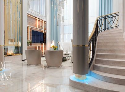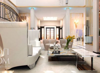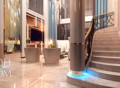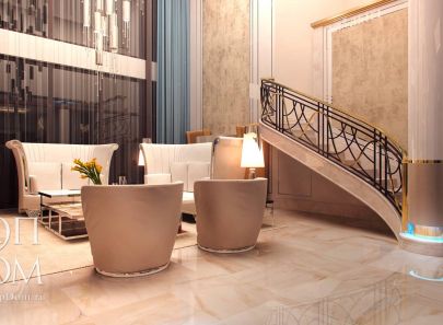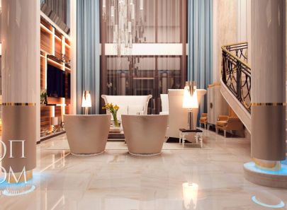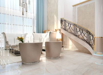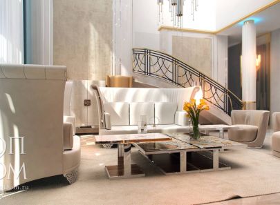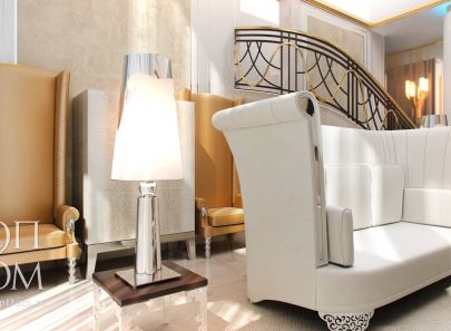 На мягкой мебели сделан главный акцент. В центре – композиция из двух диванов и кресел. Диваны оригинальной формы с цельной высокой спинкой и боковинами напоминают раскрывающийся цветочный бутон. Они украшены блестящими хромированными вставками и резными передними ножками. Высокая спинка отгораживает от лишнего шума и взглядов, для сидящих на диване людей формируется своя, очень уютная атмосфера. У стены ближе к лестнице организовано еще одно место отдыха с двумя высокими креслами наподобие трона. Их обивка цвета темного золота и блестящие ножки продолжают воплощать идею великолепия.