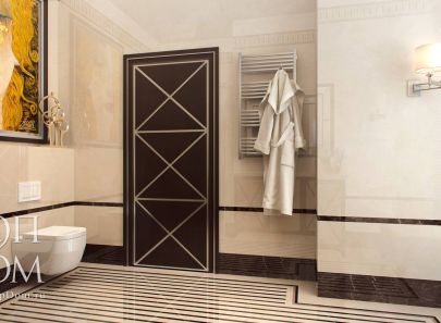 В угловой спальне центральное место отведено роскошной кровати с изголовьем, отделанным в технике капитоне. Спальное место выделено напольным покрытием: темно-коричневая паркетная доска украшена белой виньеткой на границе с желтой керамикой.