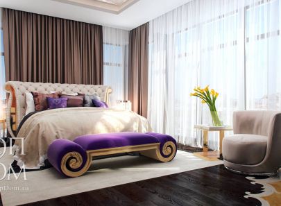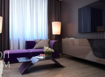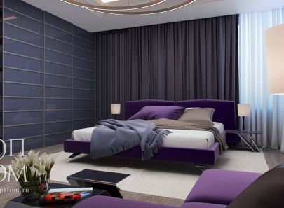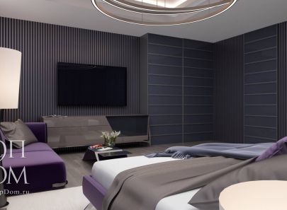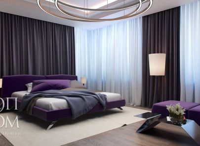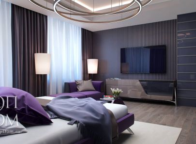 Интерьер более темный, насыщен фиолетовыми и серыми оттенками (обои на стенах, шторы, фасады шкафов). Необычной формой с ломаными линиями привлекают внимание журнальный и прикроватные столики. Весьма оригинален основной светильник из нескольких крупных колец на подвесах.