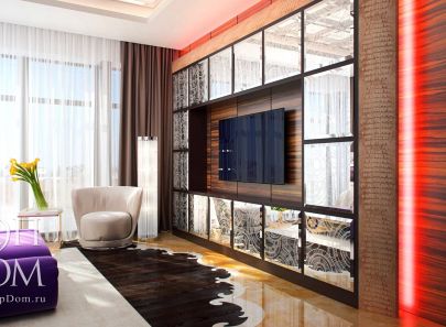 Зона ТВ оформлена выносной консолью с множеством зеркальных панелей с филигранным рисунком. По периметру она отделана фактурной плиткой, подсвеченной красным цветом.