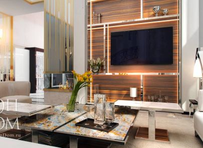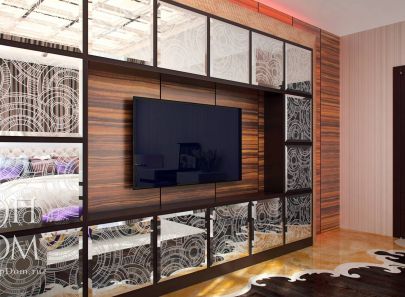 Зона ТВ обшита шпоном зебрано в коричнево-желтой гамме. Рельеф задают блестящие профили-полки с подсветкой. Слева примыкает портал биокамина, его украшает огромная зеркальная панель с золотым рисунком.