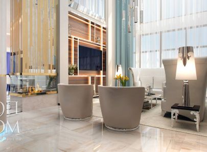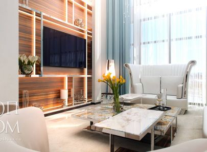 Общественная часть интерьера получила светлый бело-бежевый фон, спальные комнаты насыщены красками. Объединяющее начало проекта – необычные формы мебели, притягивающие взгляд уникальные аксессуары и отдельные элементы декора.