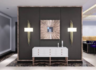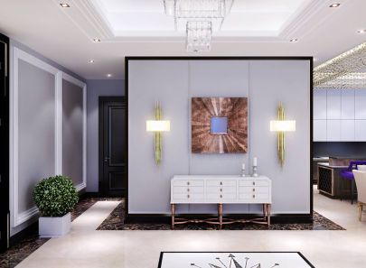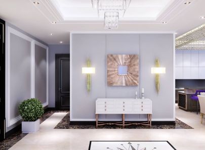 Пространство прихожей организует декоративная перегородка с квадратным зеркалом и комодом. В зависимости от вариантов исполнения она обшита светлыми бежевыми или темно-серыми панелями и окантована черным, белым или мраморным профилем. Соседняя стена прихожей окрашена в нейтральный серый оттенок и декорирована лепниной. В центре холла обращает на себя внимание напольное панно с графичным изображением розы ветров.