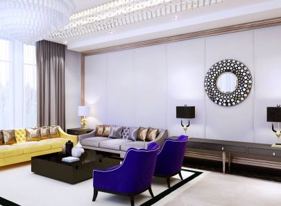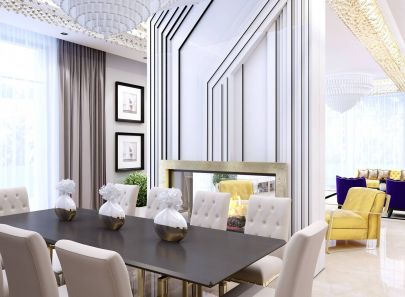 Контраст белого и черного, оттенки серебра и золота, хрусталь, зеркала в необычных рамах сделали интерьер дома оригинальным и элегантным. Яркие желтые, синие краски привнесли остроту вкуса. Аксессуары используются в небольших количествах, чтобы не произошло перенасыщение интерьера мелкими деталями.