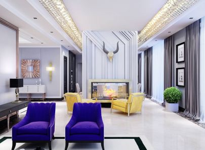 Авторы проекта стремились воплотить в интерьере дома атмосферу утонченности, присущую арт-деко, а вместе с тем создать оригинальную и функциональную обстановку с яркими красками.