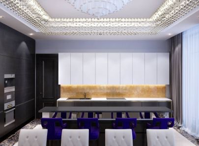 Цветное настроение затронуло также дизайн кухни и воплотилось в синих барных стульях и фартуке из желтоватого травертина. В остальном интерьер рабочей зоны выдержан в черно-белом варианте, с контрастными фасадами шкафов.