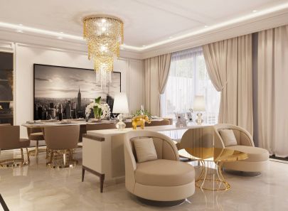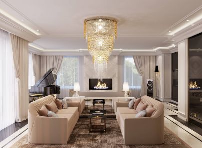 Элегантные и строгие элементы неоклассики, светлая цветовая палитра сочетаются в уникальном интерьере гостиной с современными декором и световыми решениями.