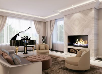 Отделанный бежевым мрамором портал камина расположен в простенке. Благодаря цвету, он воспринимается единым целым с декорированными белым тюлем окнами и поддерживает торжественный настрой гостиной. Облицовочная плитка выложена таким образом, что на верхней части портала проступает геометрический рисунок.