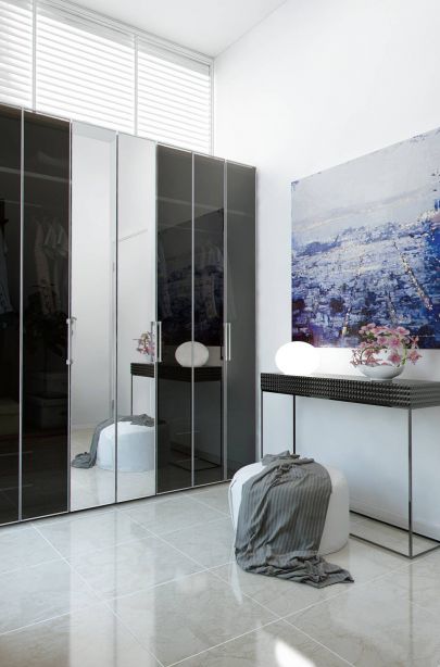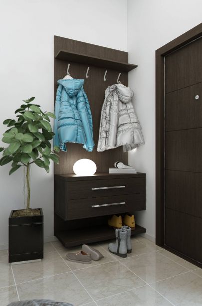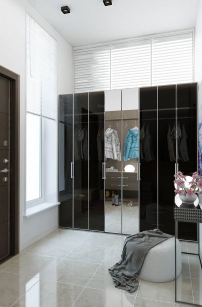 Входная зона имеет прямоугольную планировку. Это позволило слева от входа разместить гардеробный шкаф на всю ширину стены, напротив – компактную консоль с вешалкой для одежды, полкой для обуви и ящиками. Вдоль длинной стены установлен узкий металлический столик для ключей. Тонированные и зеркальные фасады шкафа работают на увеличение объема прихожей.