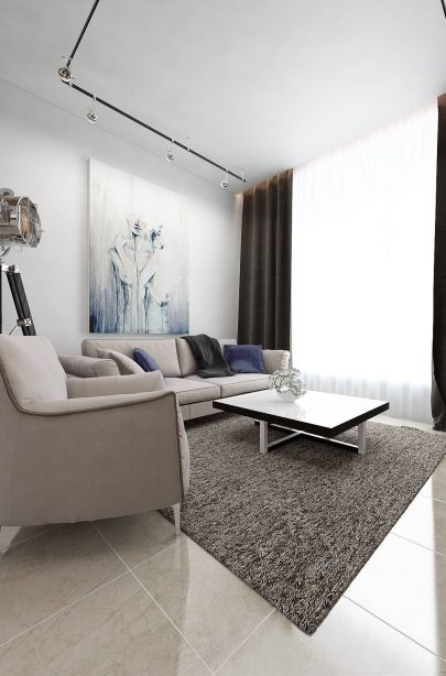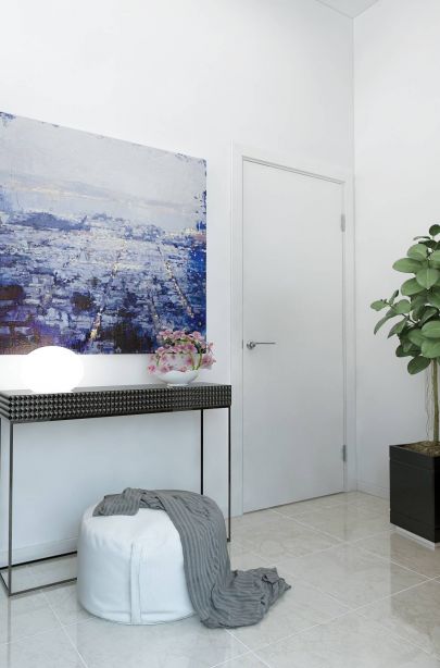 - большие картины-абстракции без рам, в бледной серо-голубой гамме (они едва выделяются на фоне белых стен, поэтому органично вплетаются в минималистский антураж),