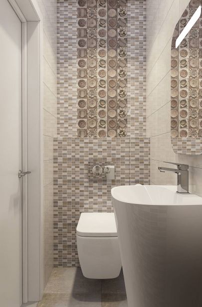 Это совсем миниатюрное помещение расположено рядом с лестницей. Бежевая плитка сочетается здесь с мозаикой в серых тонах, светлые краски помогают забыть о тесноте. Выбор компактной сантехники (раковина-монолит и подвесной унитаз) продиктован заботой о полезных квадратных метрах.