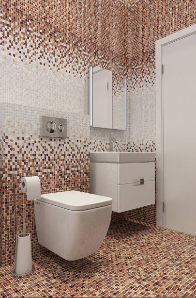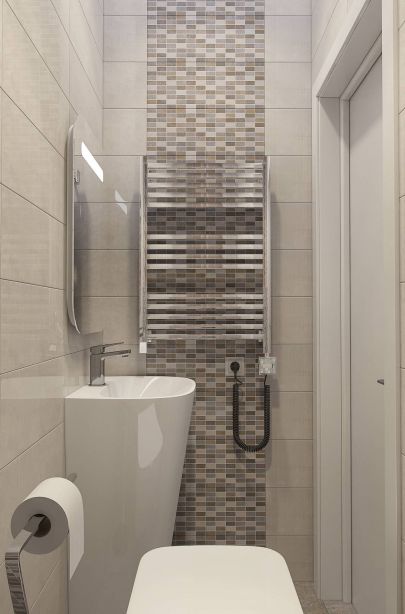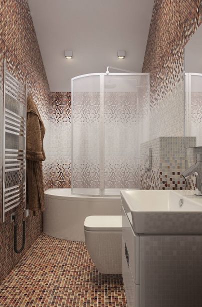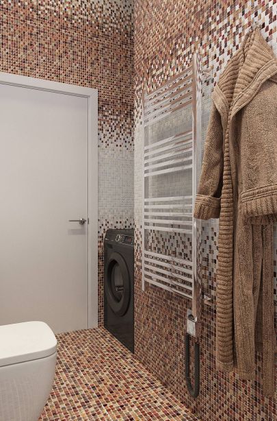 Чтобы разместить стиральную машину, потребуется забрать часть пространства у примыкающей спальни. У дальней стены монтируется ванна с защитным экраном для душа. Пол и стены облицованы бело-коричневой мозаикой, игра с тональностью добавляет комнате глубину.