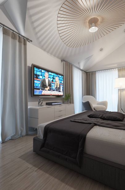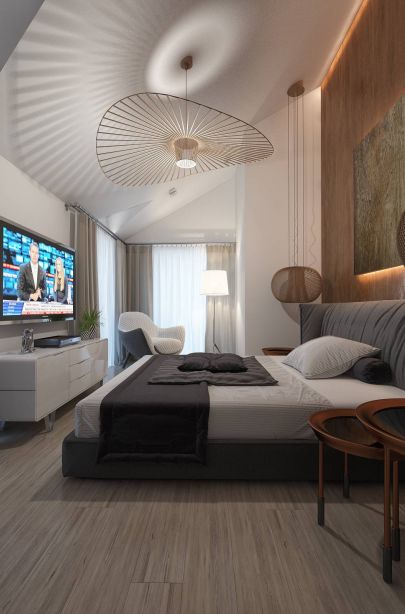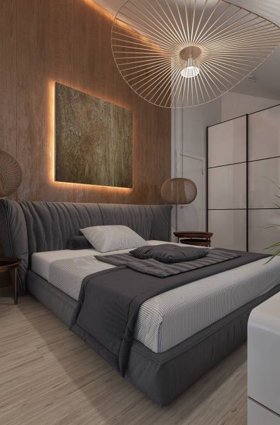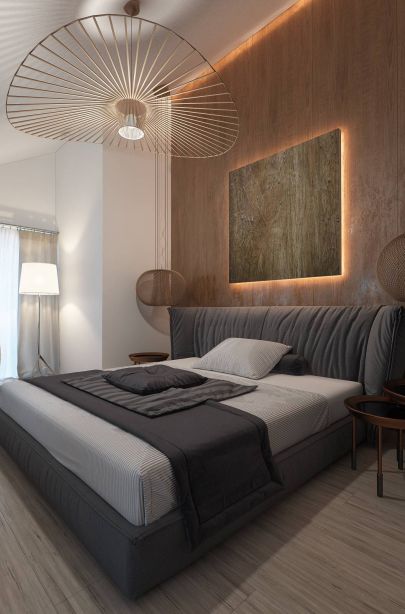 Большая по размеру комната получила более теплое настроение, что легко читается уже в оформлении мягкого изголовья кровати. В интерьере спальни активно используется дерево (напольное покрытие, обшивка стены, декоративная панель с подсветкой). Акцент в декоре – снова на светильники: подвесные лампы с абажурами-шарами и фантазийную люстру.
