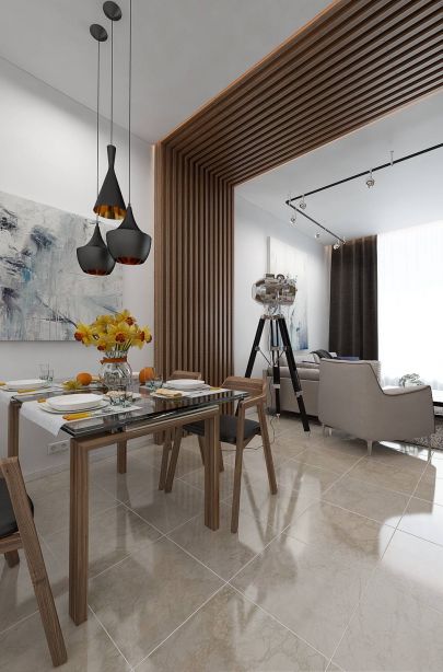 Пространство поделено на половины, визуальной границей служит поперечная композиция из деревянных реек, связывающая стены и потолок. А вот мраморный керамогранит, наоборот, подчеркивает цельность интерьера обеих зон.