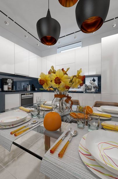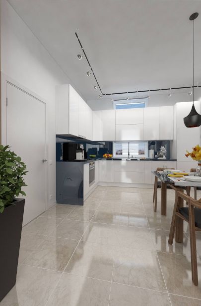 За счет дизайна белоснежные кухонные шкафы выглядят естественным продолжением стен, словно вырастая из них. Кухонный фронт имеет Г-образное расположение, что помогает максимально эффективно выделить площадь для обеденной зоны. В столовой группе – квадратный стол с прозрачной стеклянной столешницей и стулья с деревянными ножками и спинками. Смотрится лаконично и комфортно. Присутствие в дизайне мебели дерева перекликается с реечной обшивкой стен.