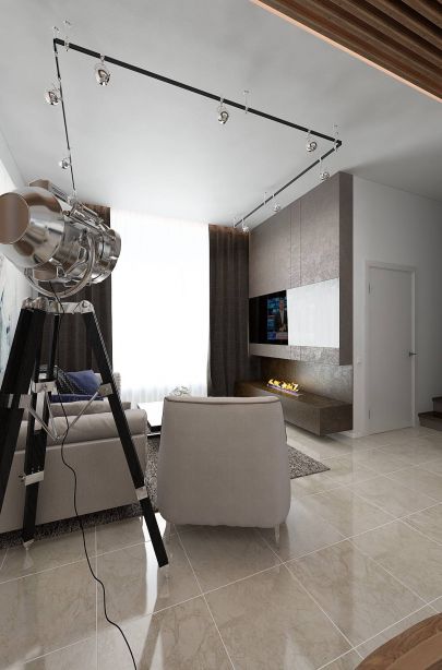 Место отдыха организовано перед панорамным окном. Светлая бежевая гамма диванной обивки поддерживает общее цветовое решение в оформлении маленького загородного дома. Темно-серые ковер и отделанная глянцевой штукатуркой стена в ТВ-зоне выгодно оттеняют монохромный интерьер. Телевизионная панель встроена в навесную конструкцию, под ней обустроен декоративный камин.
