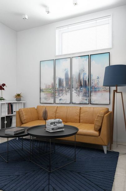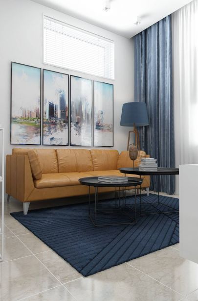 Оформить интерьеры небольшого загородного дома так, чтобы здесь было уютно, – увлекательная задача. В компактной комнате организовано место отдыха с кожаным диваном и мягким ковром, ТВ-зона, рабочее место, системы хранения (стеллажи и подвесные шкафчики). В комбинации с желто-коричневой обивкой дивана глубокий синий цвет ковра, штор и торшера смотрится не так холодно. Модульная картина над зоной отдыха собирает всю палитру комнаты воедино.