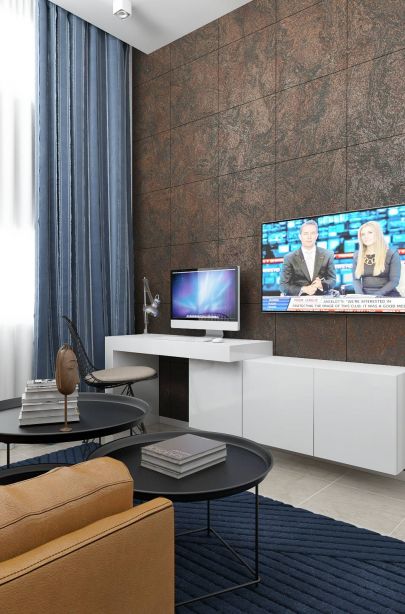 Обстановка по-европейски строгая, но именно этим и притягательна. Сильный цветовой и фактурный акцент – облицовка стены имитацией ржавых металлических плит.