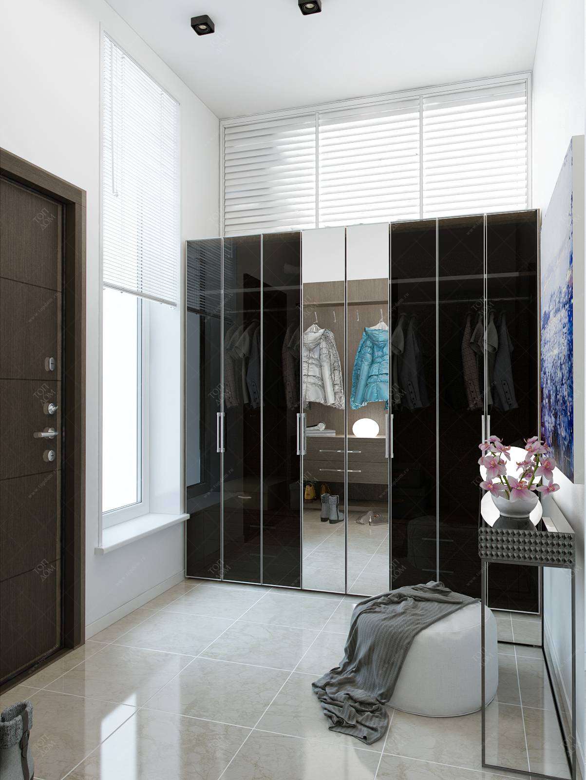 Входная зона имеет прямоугольную планировку. Это позволило слева от входа разместить гардеробный шкаф на всю ширину стены, напротив – компактную консоль с вешалкой для одежды, полкой для обуви и ящиками. Вдоль длинной стены установлен узкий металлический столик для ключей. Тонированные и зеркальные фасады шкафа работают на увеличение объема прихожей.