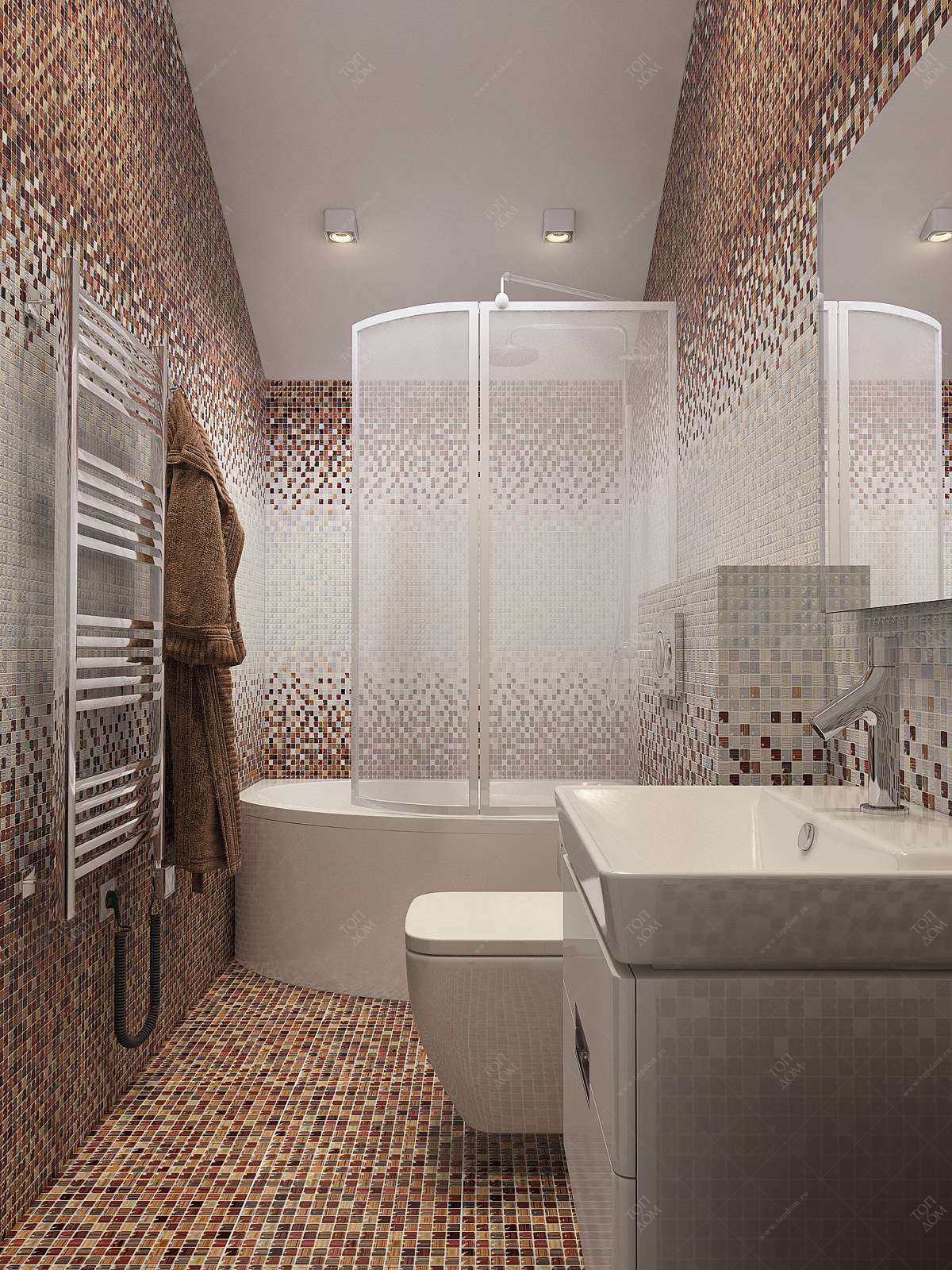 Чтобы разместить стиральную машину, потребуется забрать часть пространства у примыкающей спальни. У дальней стены монтируется ванна с защитным экраном для душа. Пол и стены облицованы бело-коричневой мозаикой, игра с тональностью добавляет комнате глубину.