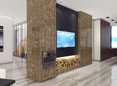 Обеденная зона акцентирована круглым столом и ярко-желтым цветом обивки стульев. Необычный элемент обстановки – настоящий камин с поленницей. В современном доме это традиционный атрибут уюта. Перегородку с дымоходом и симметричный ей участок стены предлагается отделать тоже мраморными плитами, а над сложенными дровами подвесить телевизор.