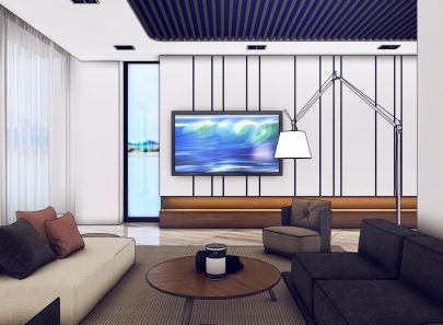 Центральная потолочная ниша отделана темно-коричневыми рейками, дизайн интерьера акварельными красками позволяет красиво передать их насыщенный кофейный оттенок. Место с ТВ-зоной обшито объемными вертикальными панелями, на соседней стене – зеркальная облицовка, зрительно расширяющая площадь.