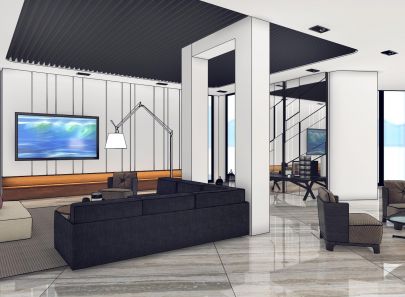 Большое светлое пространство общественной части в эскизных интерьерах дома открыто солнечным лучам, благодаря расположению зон вдоль панорамного остекления. Холл, гостиная и столовая с кухней свободно переходят друг в друга, образуя удобную в использовании жилую среду. Современный стиль с его лаконичными красками и природными материалами наделил обстановку комфортом.