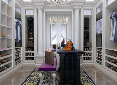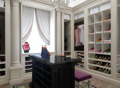 Ее дизайн такой же светлый, как библиотека. Открытые шкафы, полки для обуви и витрины для украшений встроены в ниши. На контрасте с белыми стенами задняя часть ниш окрашена черным, это придает шкафам дополнительную зрительную глубину. Окно и дверной проем обрамлены античными колоннами, так строгая классика в интерьере гардеробной создает парадные образы. Пол выложен темно-бежевой мраморной плиткой с орнаментальной цветной вставкой в центре, в сдержанном дизайне комнаты этот яркий акцент дополнит лиловая скамья на белом основании.