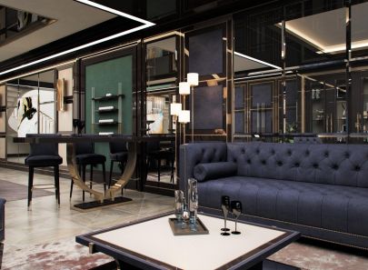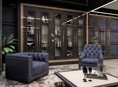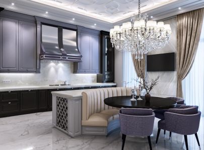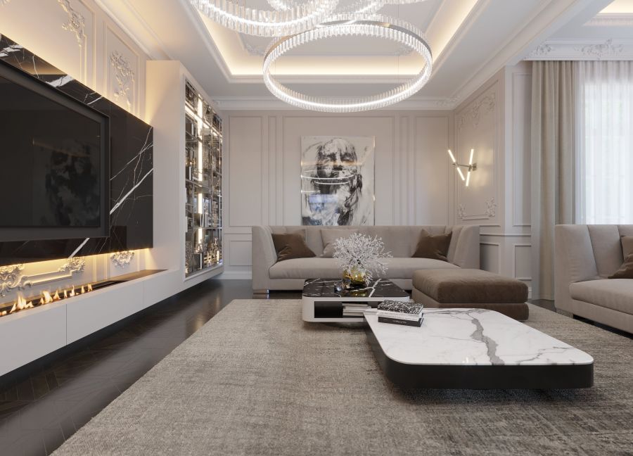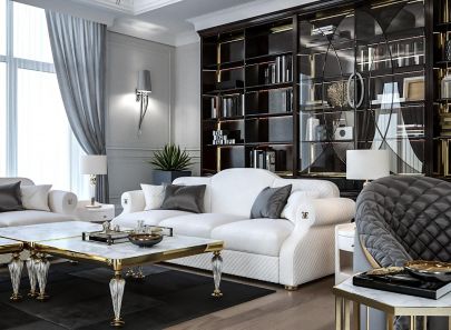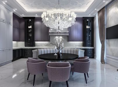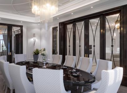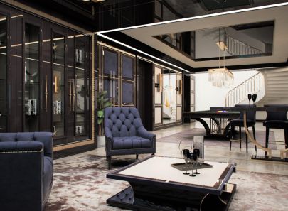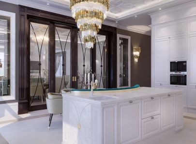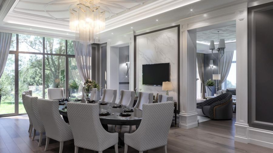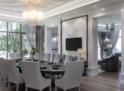 Внутренняя отделка загородного особняка выполнена в смешанном дизайне – сочетании неоклассики и арт-деко. Акцентное включение золота, серебра, черного глянца создает великолепный декор, поддержанный продуманной планировкой.