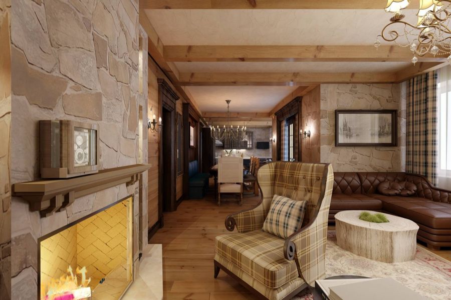 Очень красивая вариация в дизайне частных домов, в основе которой – отделка деревом и камнем. В частности, деревом обшиваются пол и потолок, обязательный элемент антуража – потолочные балки, декоративные или являющиеся частью кровельной конструкции.