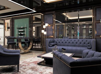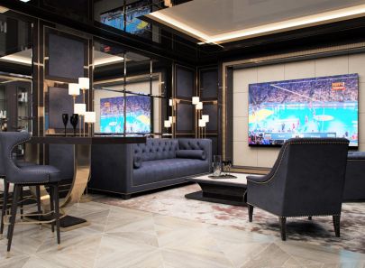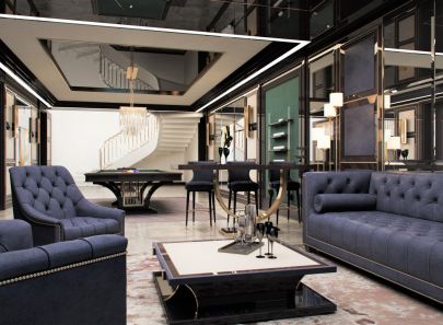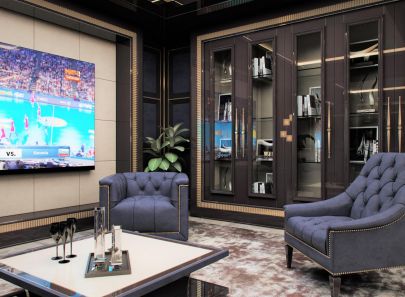 Комната расположена на цокольном этаже и делится на игровую зону и место отдыха. В центре помещения – бильярдный стол из темного дерева на оригинальных опорах. Серо-фиолетовая обивка дивана, кресел и барных стульев перекликается со стеновыми панелями такого же оттенка, разбавляя черно-бежевый фон. Отсутствие естественного освещения возмещается разноплановым световым сценарием и обилием зеркальных вставок.