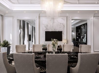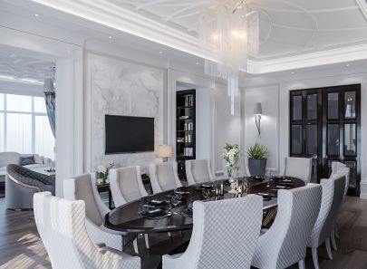 Главный в композиции – овальный стол на двенадцать персон из темного дерева. Его оформление поддерживают темно-коричневые двери. Красивый контраст создают белоснежные мягкие стулья, отделка стен и мраморная панель с телевизором.