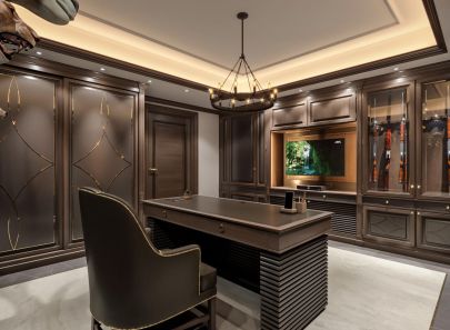 Возможности английской стилистики хорошо видны на примере оформления кабинета из проекта консервативного дизайна в загородном доме. Дубовые стеновые панели создают выгодный фон для клетчатого декора. Массивный рабочий стол украшен резьбой, камин – изящной лепниной. Зона бара в углу выделена традиционным кессонным потолком.