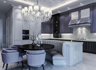 Кухонный остров совмещается с обеденной зоной: фигурный диван врезан в столешницу. Необычные стулья с двойными спинками компенсируют строгость глухих кухонных фасадов.