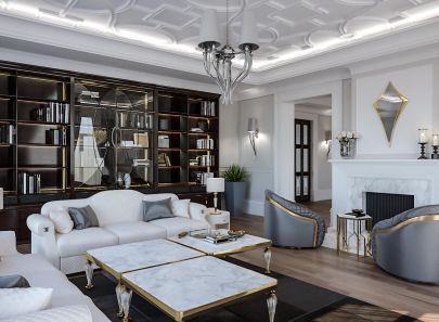 Проект строгого классического дизайна сочетает монументальные мебельные формы, темно-ореховую деревянную обшивку, белые шкафы с филенчатыми фасадами. Композиционный центр притяжения в гостиной – высокий каминный портал со скульптурами львов и внушительным рельефным фризом.