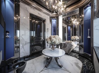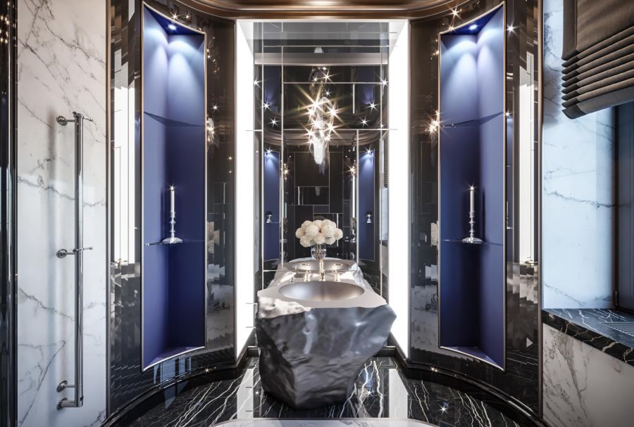 Роскошное оформление санузла сочетает черно-белую мраморную облицовку с синими нишами по углам. Глянцевые и зеркальные поверхности наполняют помещение отраженным светом от встроенных и подвесных светильников. Фокус внимания – на дизайнерскую раковину в форме серебряного слитка.