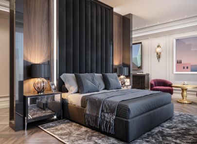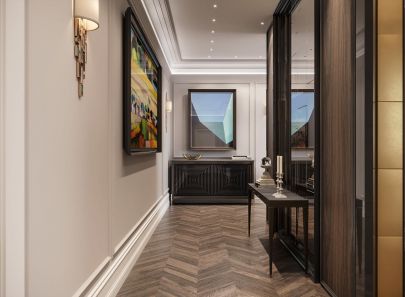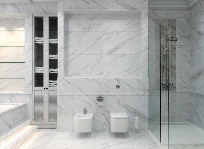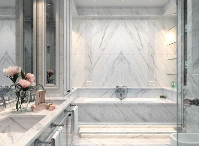 Спроектированы две зоны умывания, что сэкономит время на утренний туалет для супружеской пары или большой семьи. Площадь санузла позволяет установить вместительную ванну на подиуме с подсветкой, подвесные модели унитаза и биде, застекленную душевую кабину. Зона купели выделена декоративными настенными пилястрами.