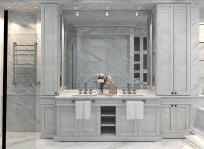 Красивые интерьеры комнат в доме включают отделку санузла с элементами классики. Белая мраморная облицовка визуально расширяет помещение, классическое цветовое решение подхватывают деревянные шкафы и каменная столешница.