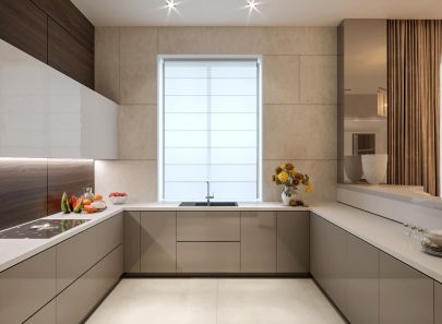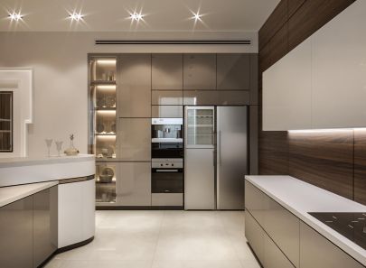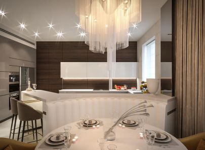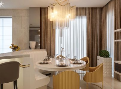 Нейтральный светло-бежевый оттенок напольной плитки и оштукатуренных стен создает традиционно гармоничный фон для нарядной белой мебели и темно-коричневых деревянных панелей в зоне готовки. Нотку роскоши в современный сдержанный декор вносят золотые акценты – фигурная люстра над обеденным столом, полукруглые стулья, блестящий кант на барной стойке, шторы цвета темного золота.