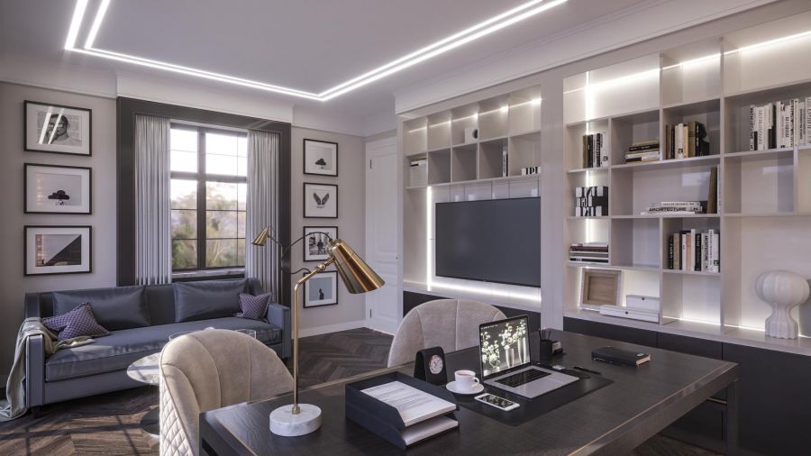 Темно-коричневый письменный стол простой формы дополняет выложенный классической "елочкой" паркет. Мягкие кресла оттенка кофе с молоком обогащают цветовую гамму вместе с золотистыми светильниками. Боковую стену занимают системы хранения с подсвеченными белыми полками и нижним рядом глухих шкафов с черными фасадами.