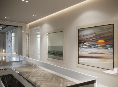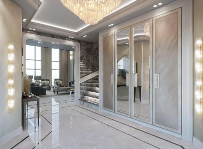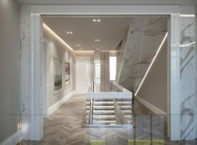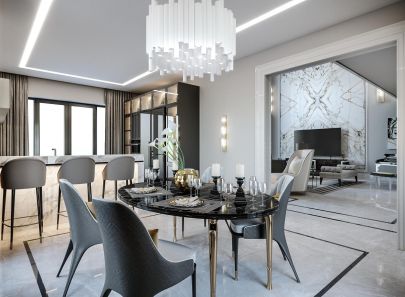 В оформлении загородного коттеджа найден баланс между роскошью и уютом, классической аристократичностью и современными материалами. Основой стилевого решения выбрано арт-деко – направление, в котором красота интерьеров премиум-класса сочетается с функциональностью и домашним комфортом. Ведущим декоративным приемом стали крупные геометрические формы.