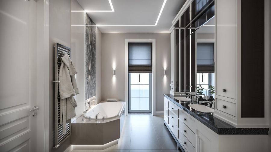 Благородная классика в интерьере ванной реализована привлекательной контрастной отделкой и средствами арт-деко. Удается создать шикарную, но без ненужных излишеств обстановку.