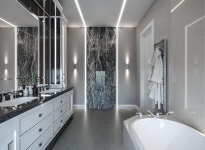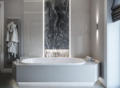 Ее многоугольный корпус подсвечен снизу, что создает интересный эффект подвесной модели. Темно-серая мраморная панель со встроенной нишей контрастно выделяет зону купели в белом интерьере. С помощью светодиодной подсветки, переходящей со стенной плоскости на потолок, мраморная облицовка тематически связывается с таким же цветовым и текстурным акцентом в зоне входа.