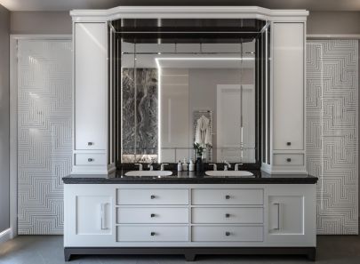 Двойная раковина встроена в черную каменную столешницу, в дизайне шкафов симпатично контрастируют белые матовые фасады и блестящая черная фурнитура. Боковые стеновые панели с геометрическим узором поддерживают цветовое решение комнаты. А классические элементы – дверной портал, оконные наличники, высокие белые плинтусы – создают нарядное обрамление.
