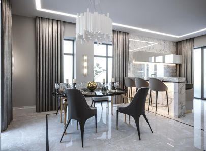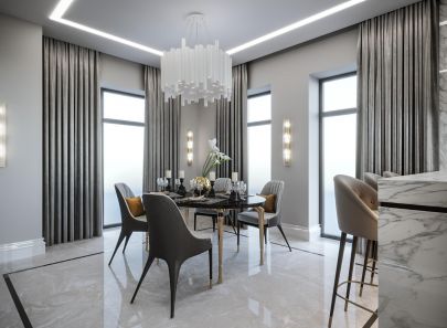 Элегантный классический интерьер столовой логично продолжает отделку гостиной, с которой сообщается через широкий проем. Центральный элемент – большой овальный стол с черной мраморной столешницей и золотистыми ножками. Благородный серебряный цвет добавляют серые мягкие стулья и отливающие металликом шторы.