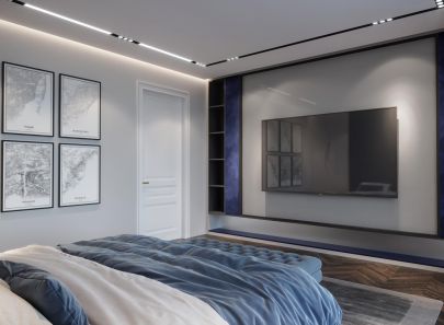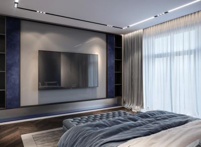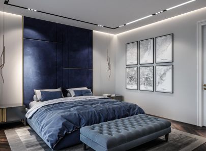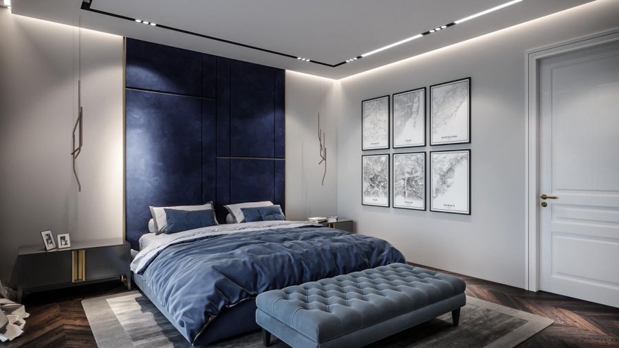 Декоративная темно-синяя панель за изголовьем задает цветовую доминанту – элегантные цвета в интерьере комнаты выдержаны в прохладной серо-синей гамме: начиная с прозрачных серых оттенков стен через голубые оттенки текстильного убранства и банкетки к густой синеве настенного декора. А чтобы помещение не казалось излишне холодным, пол покрыт натуральным паркетом – его теплый и насыщенный тон делает обстановку уютной и камерной.
