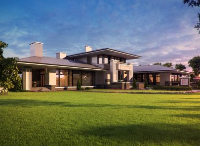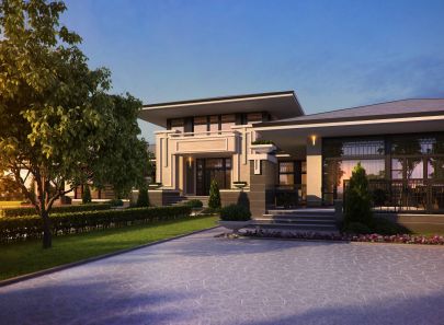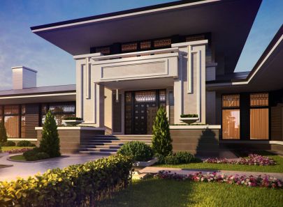 Выполненный в необыкновенно популярном стиле прерий проект фасада одноэтажного дома выглядит стильно и современно. В основе его сооружения – точные параметры и надежная лаконичная конструкция.