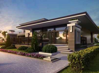 Участок очень большой. В нем достаточно места и для прогулочной территории, и для декоративных садово-парковых элементов. Особенно выделяются изысканные клумбы, дополняющие утонченный образ всех фасадов одноэтажного дома.